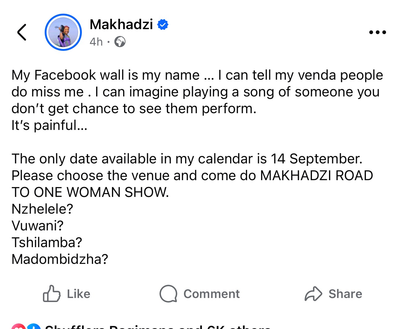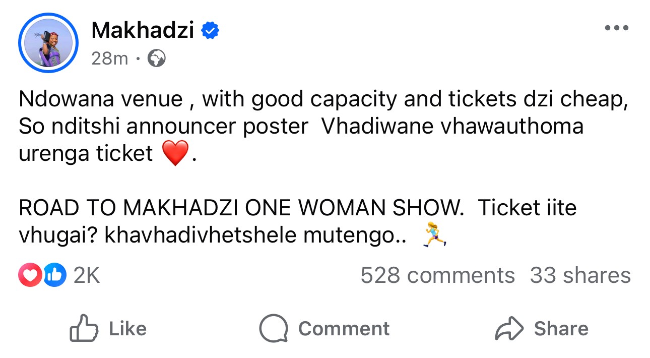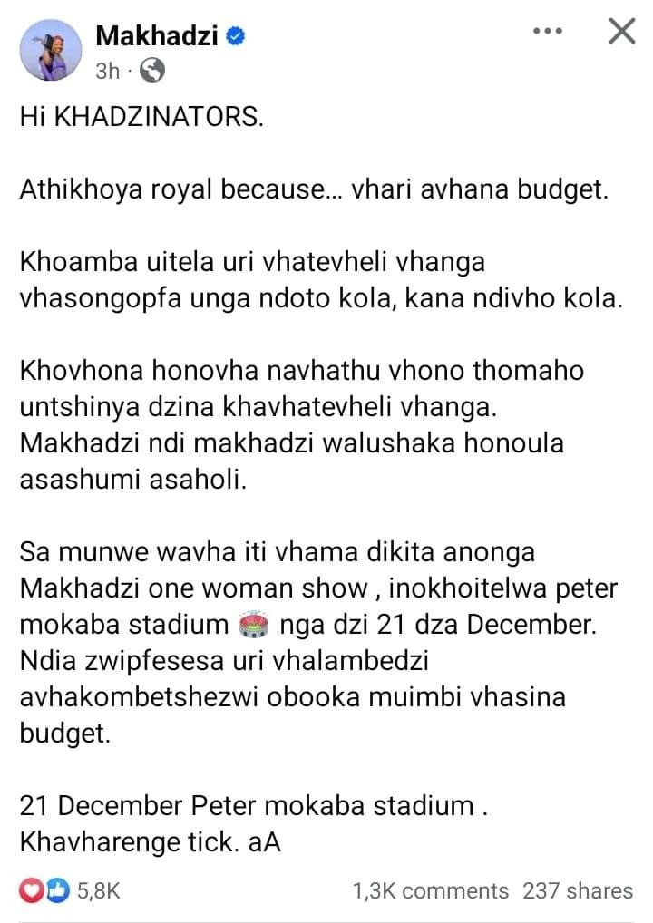 Makhadzi shared a post on Facebook that she will be hosting a promotional event for her one-woman show that will take place on the 21 of December 2024.