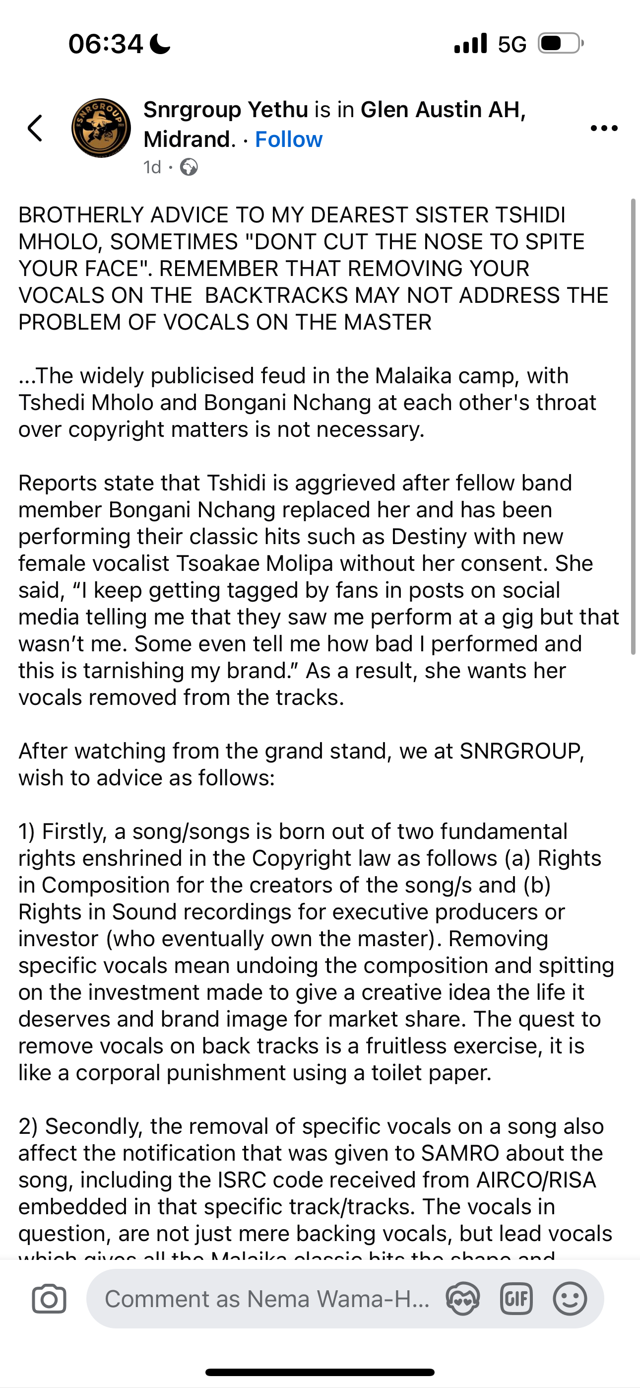 ...The widely publicised feud in the Malaika camp, with Tshedi Mholo and Bongani Nchang at each other's throat over copyright matters is not necessary.
