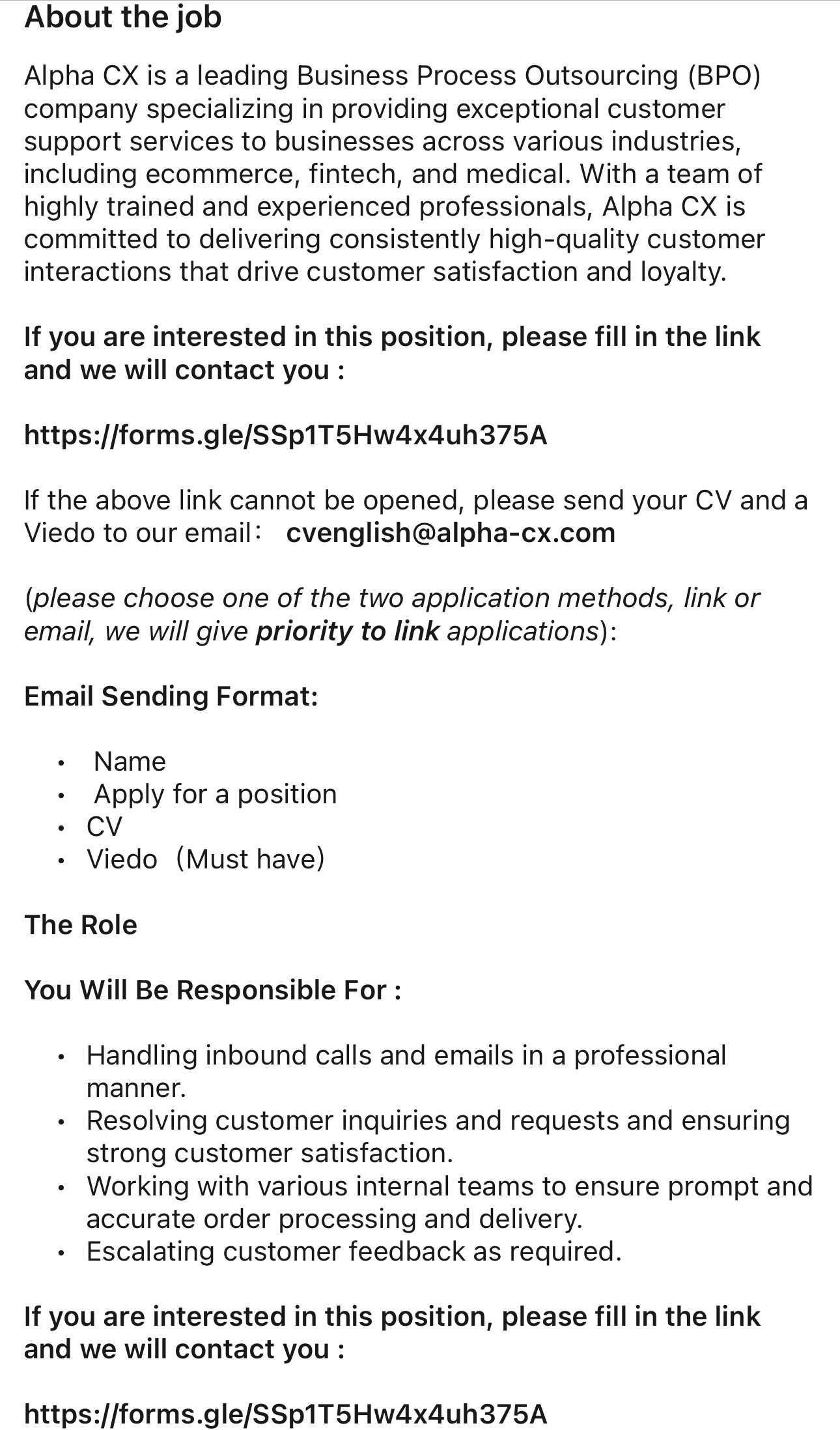 If the above link cannot be opened, please send your CV and a Viedo to our email: cvenglishalpha-cx.com